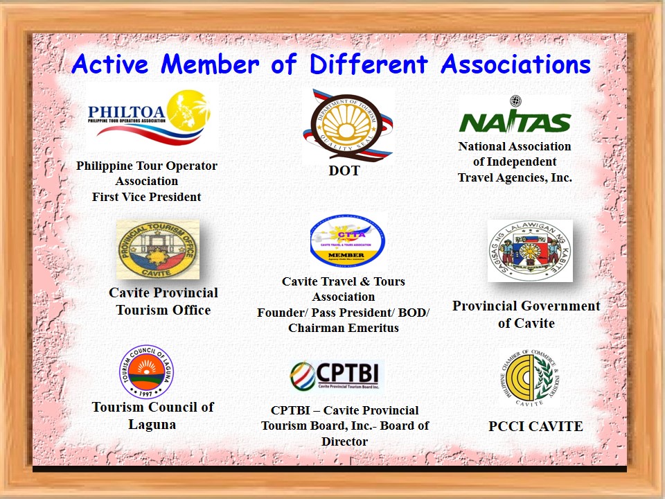 Blessed Genesis is an active member & accredited by the DOT (Department of Tourism), Cavite Provincial Tourism Office (CPTO), and a member of various Philippine travel and tours association such as VP for Philippine Tour Operator Association (PHILTOA), Former Board of Director of National Association of Independent Travel Agencies, Inc. (NAITAS), CALABARZON Travel Agencies Association, Board of Director of Cavite Provincial Tourism Board, Inc. (CPTBI), Founding President of CAVITE ALLIANCE OF INDEPENDENT TOUR OPERATORS, INC. (CAITO), Founding President of Cavite Travel & Tours Association (CTTA), Member of Laguna Travel & Tours Association (LTCATO-LTTA), and the Vice President for Tourism of Philippine Chamber of Commerce & Industry (PCCI Cavite).